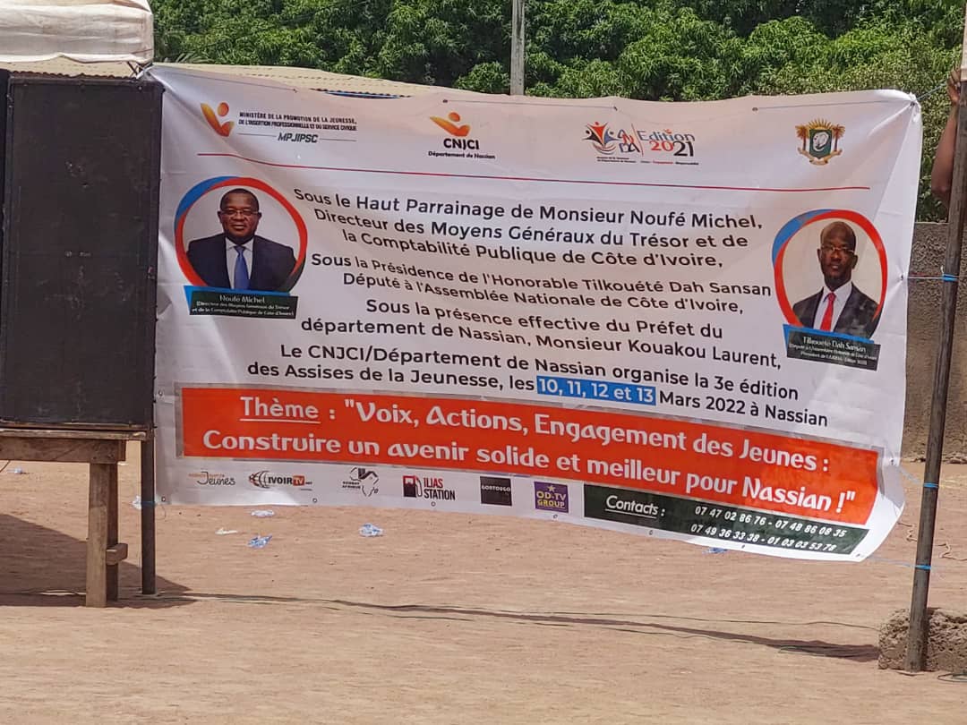 Unite.ci , Nassian le 13 mars 2022 : La place publique de Nassian a abrité ce dimanche 13 mars 2022, la 3ème édition des assises de la jeunesse de département initiées par la délégation départementale du Conseil national de la jeunesse de Côte d’Ivoire (CNJCI).