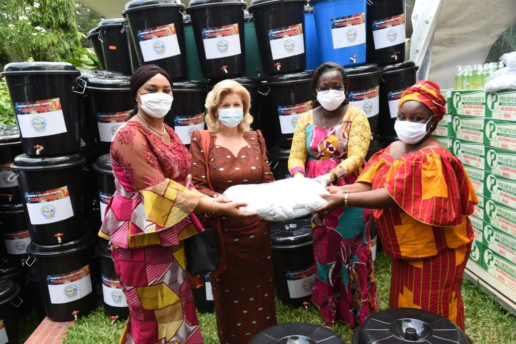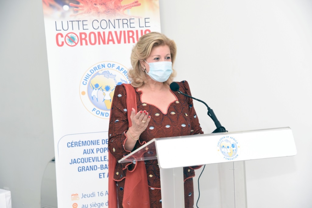 unite.ci, Abidjan le 16 avril 2020 : Madame Dominique Ouattara, Présidente de la Fondation Children Of Africa a offert des dons en produits alimentaires et sanitaires d’une valeur de 210 millions F CFA à 6.000 familles démunies des localités de Dabou, Jacqueville, Azaguié, Grand-Bassam, Bonoua et Assinie.