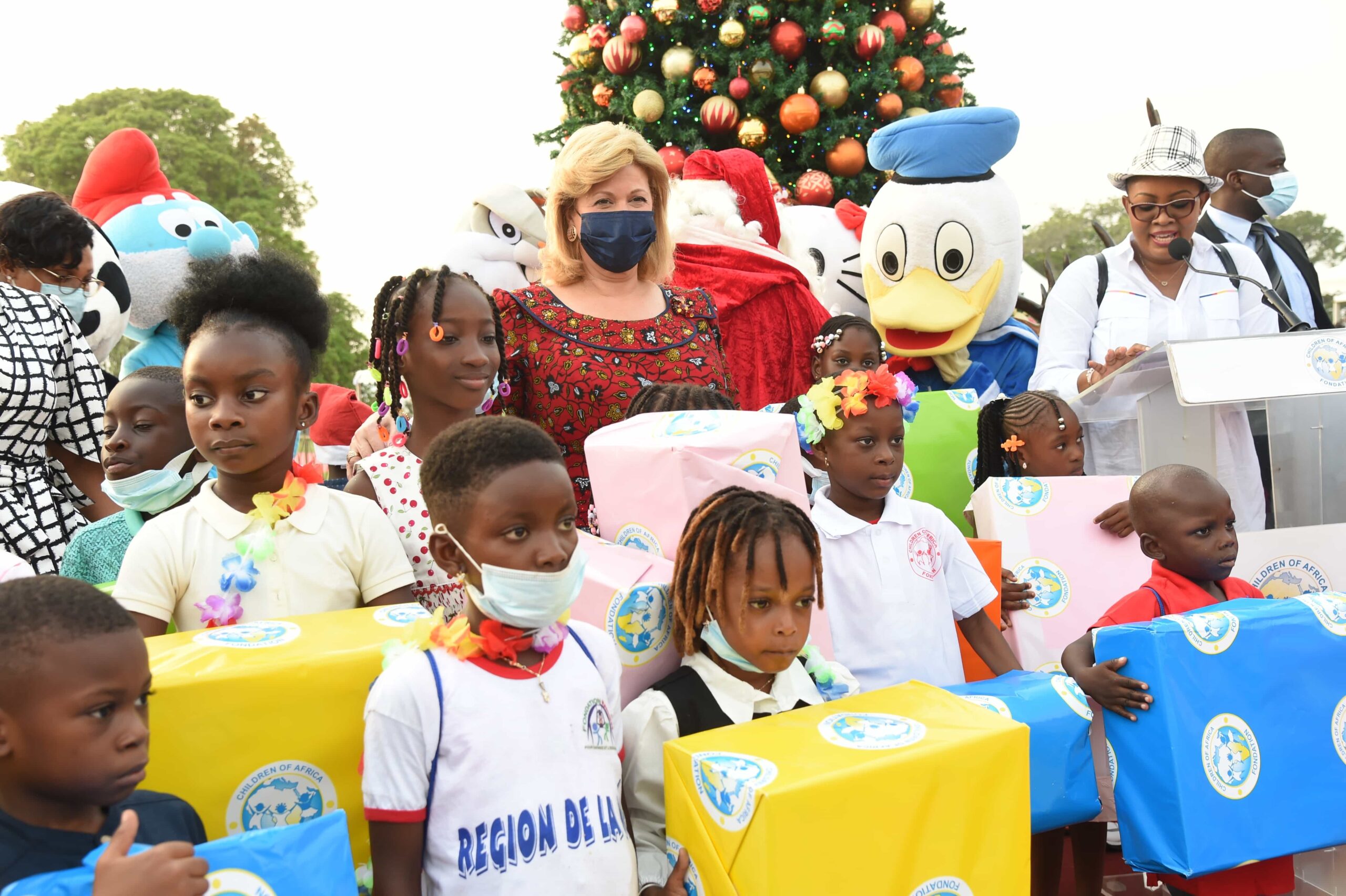 En effet, Madame Dominique Ouattara, Présidente de la Fondation Children Of Africa, a perpétré, encore une fois cette année, la tradition et la magie de Noël. Ce sont au total deux mille (2.000) enfants, âgés de 03 à 09 ans, venus de l’ensemble des communes du District Autonome d’Abidjan, de 13 Associations et ONG, de la Case des Enfants, de la Présidence, des Ministères, du Groupe Scolaire d’Excellence de la Fondation Children Of Africa et de bien d’autres structures qui ont été invités à l’occasion de cet Arbre de Noël.