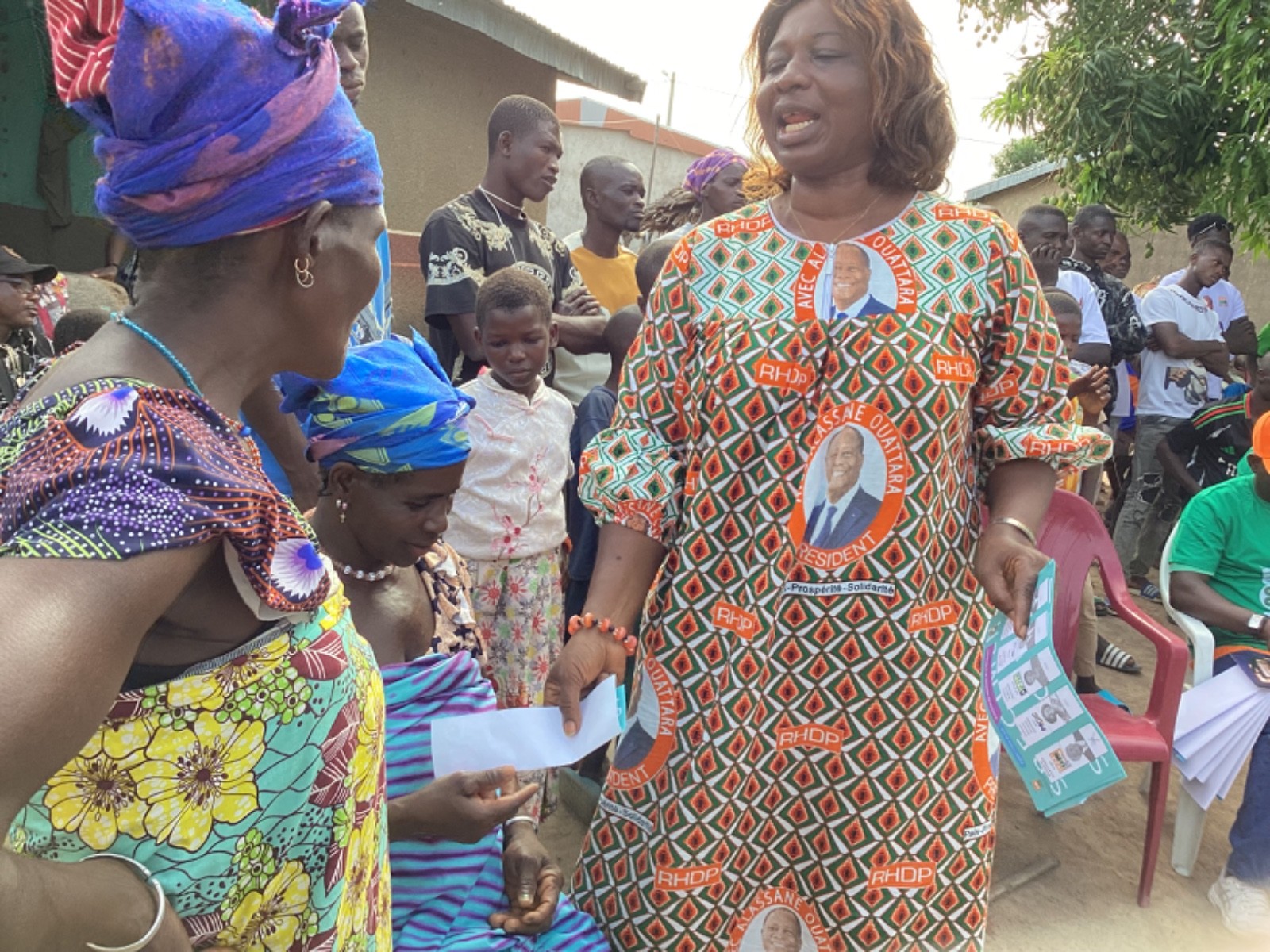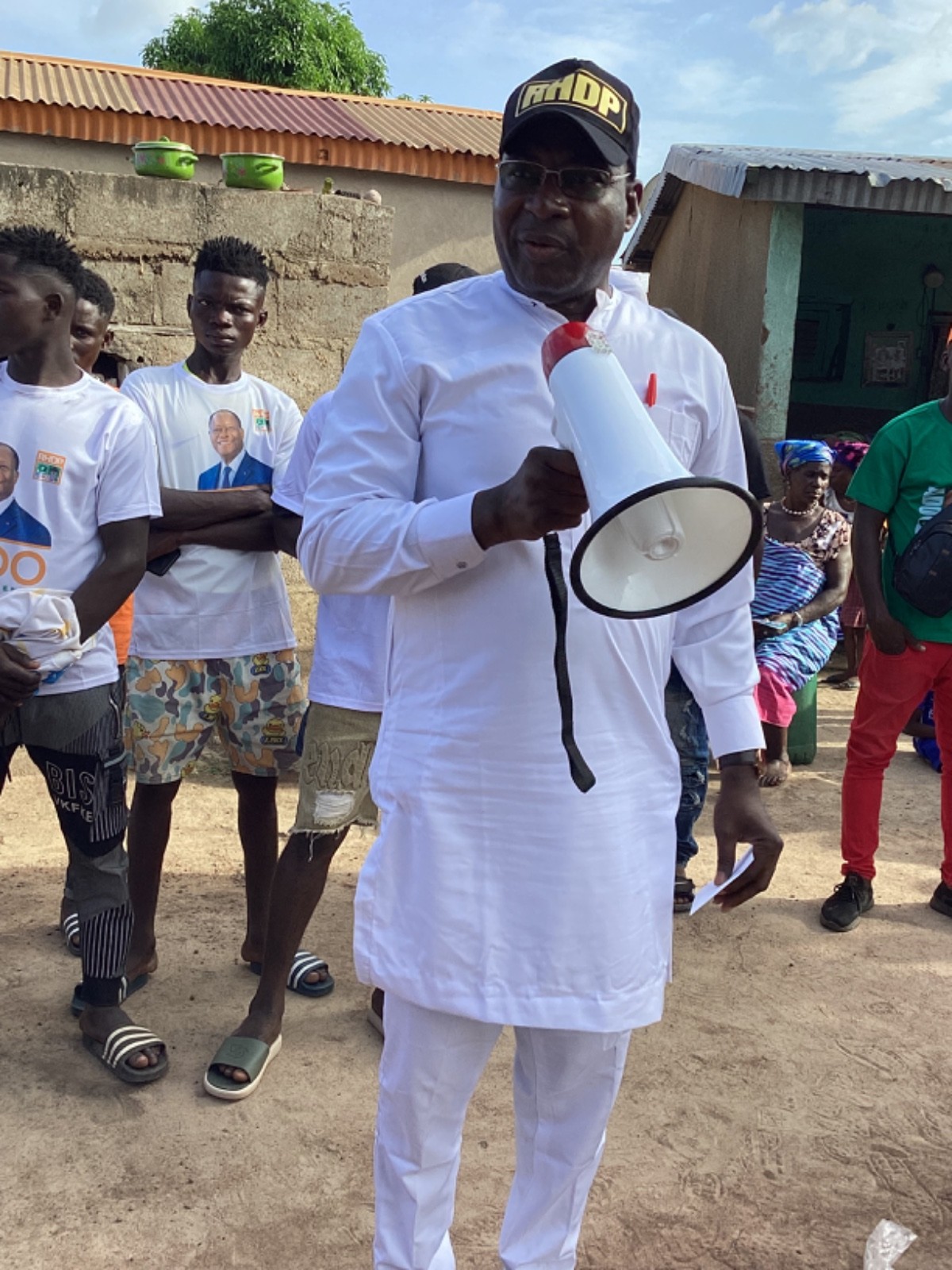 Son message est essentiellement orienté vers les femmes. Elle leur explique la technique du vote puis les invite à sortir massivement le jour-J pour accomplir leur devoir civique. Ensuite, le départemental adjoint Hien Djanvote rappelle les acquis en faveurs du département en 15 ans de gouvernance du Président sortant. Et non sans les inviter à récuperer le plus rapidement possible les cartes d’électeur, le sésame pour accéder à l‘urne. Quand l’Administratif départemental Dah Ollo intervient, c’est pour annoncer les dons de la Ministre et Du Dr Michel Noufé pour la population. Pour Boucler la boucle, interviennent successivement l’ex-député Dah Sié et le député de la circonscription Kambou Sié. Ces deux élus mettent en évidence le bilan élogieux du candidat caractérisé par les infrastructures de développement socio-économique dont les routes, les écoles, les centres de santé, l’adduction en eau potable, la création d’emploi et la promotion des cadres.