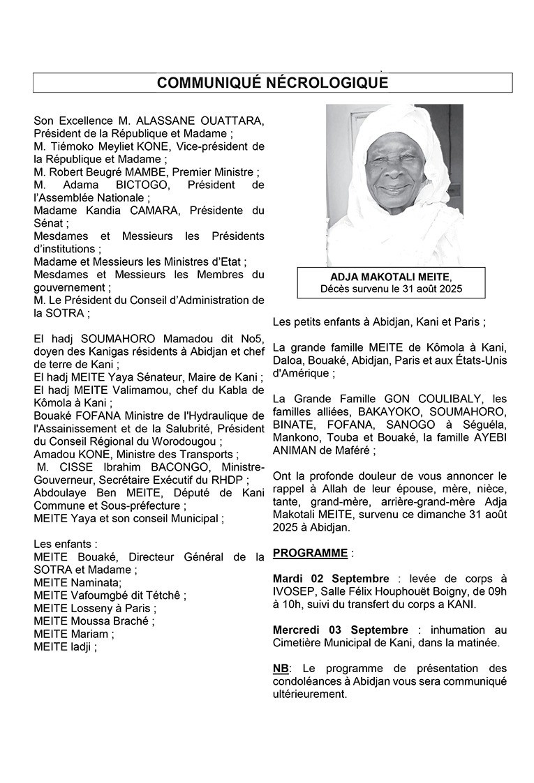 unite.ci: Décédée le dimanche 31 août 2025/ Voici le programme des obsèques de feu ADJA MAKOTALI MEITE, mère du DG de la SOTRA, MEITE Bouaké