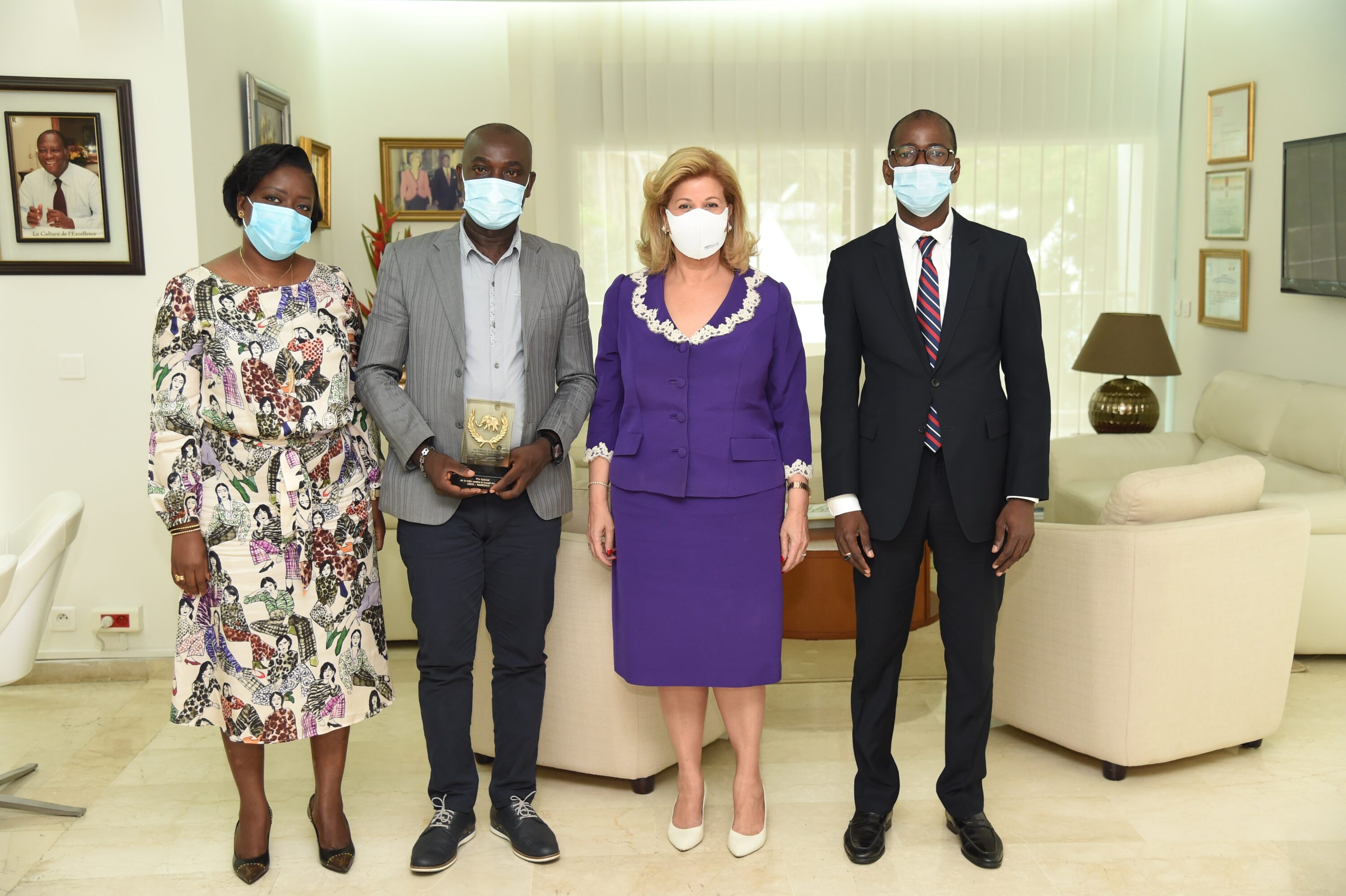 unite.ci : La Première Dame Dominique Ouattara, Présidente du Comité National de lutte contre la Traite, l’Exploitation et le Travail des Enfants (CNS) a reçu en audience M. Germain Gabo, lauréat du prix sectoriel CNS du concours Ebony 2020, le mardi 27 avril 2021, à son Cabinet à Cocody.