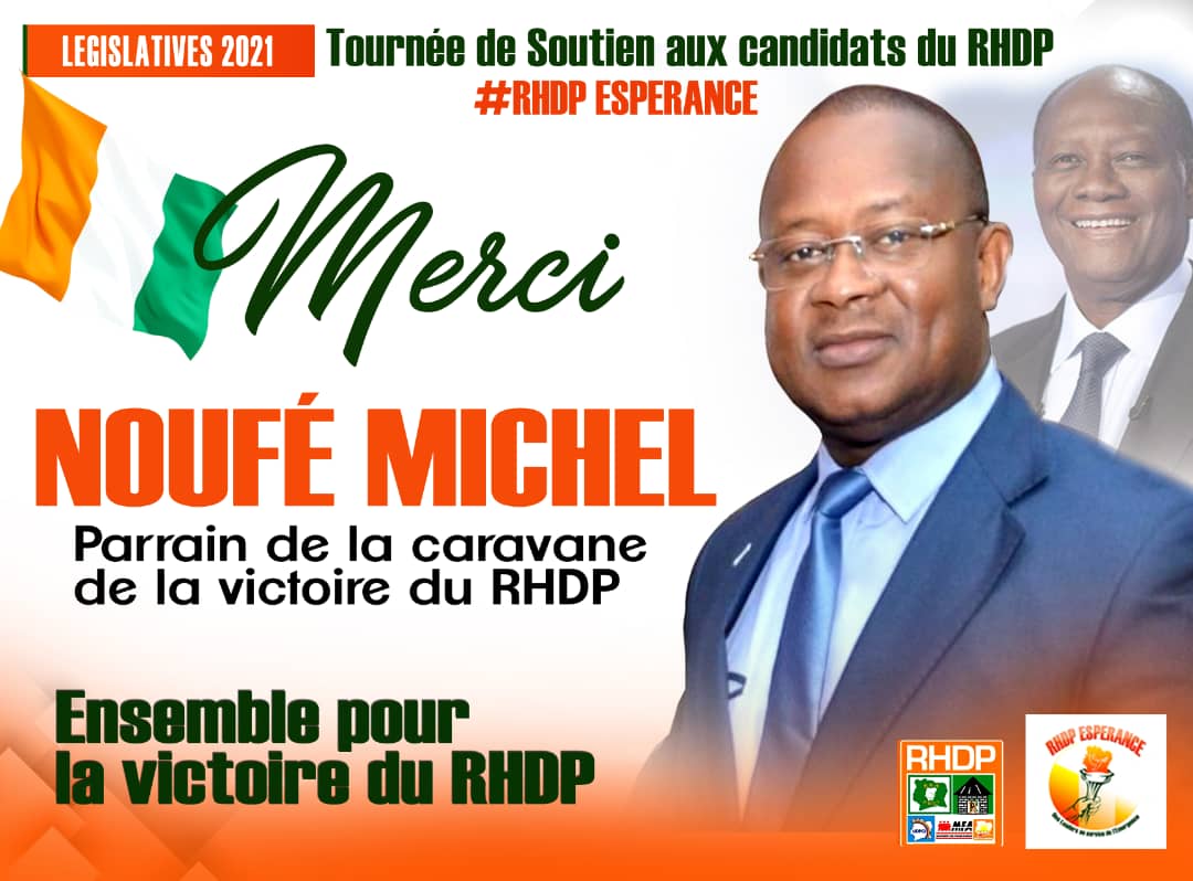 Ainsi, le RHDP qui rêve de donner une majorité confortable au Président Alassane Ouattara met les bouchées doubles. C’est dans cette même veine que le mouvement dénommé ‘’RHDP ESPERANCE’’ a initié une tournée de Soutien aux candidats du RHDP à travers plusieurs régions du pays. Pour cette caravane dite ‘’ Caravane de la victoire ’’ le parrain sollicité pour appuyer cette activité n’est autre que NOUFE Michel, le Directeur des Moyens Généraux du Trésor Public de Cote d’ivoire par ailleurs Conseiller Politique et Coordonnateur régional Associé RHDP.