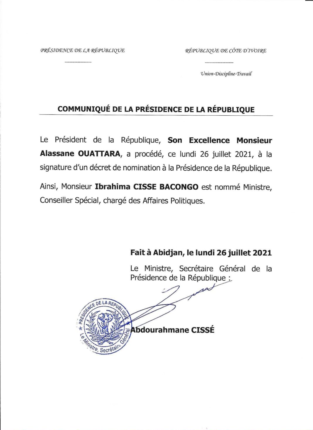 unite.ci, Abidjan le 26 juillet 2021: Ouattara nomme Ibrahima Cissé Bacongo, Ministre conseiller spécial chargé des affaires politiques, selon un communiqué officiel.