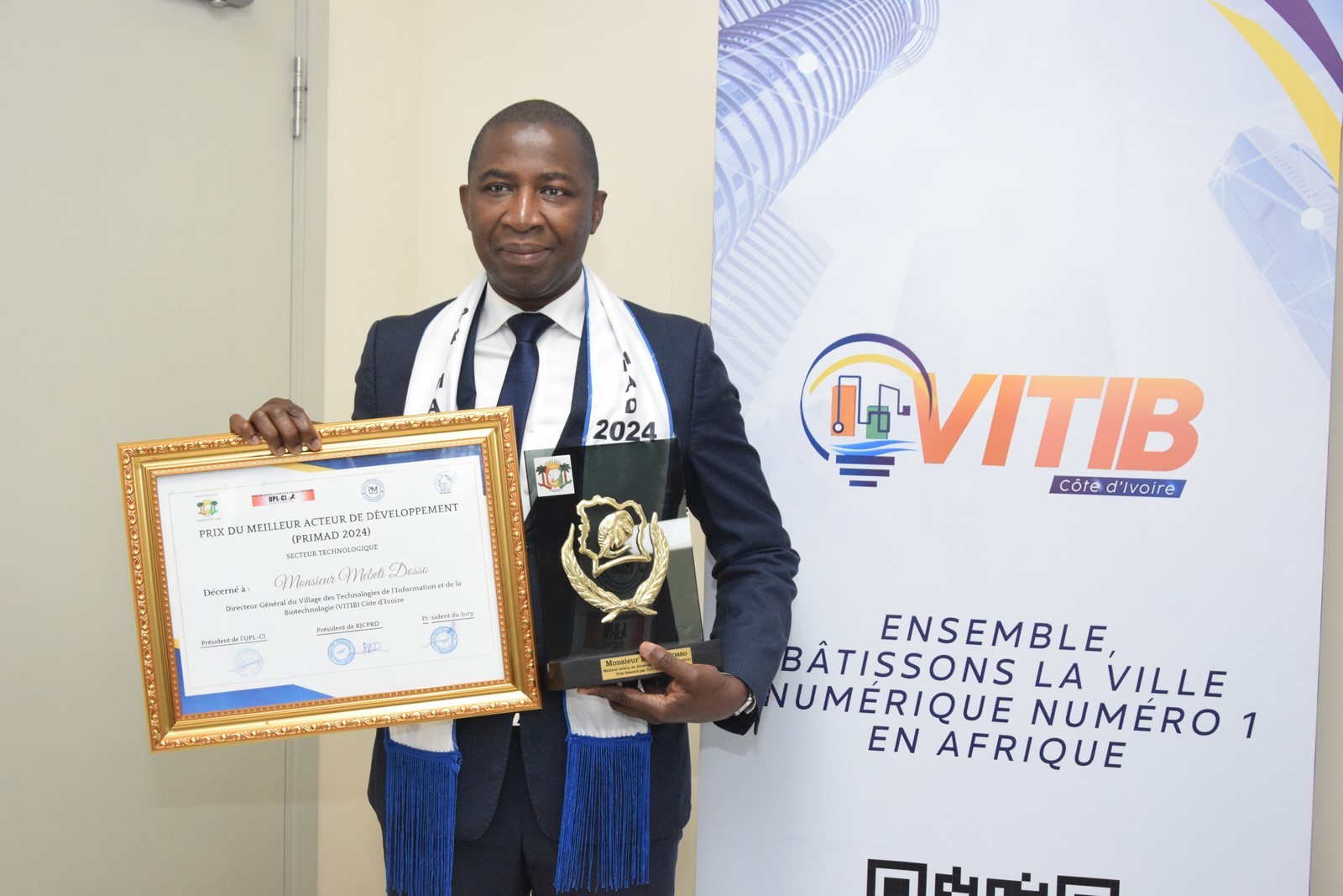Unite.ci, Grand-Bassam le 26 décembre 2024 : Le Prix du Meilleur Acteur de Développement (PRIMAD) 2024 a été décerné à Mebeti Dosso, Directeur Général du Village des Technologies de l’Information et de la Biotechnologie (VITIB), lors d’une cérémonie tenue jeudi 26 décembre 2024, au siège de cette institution à Grand-Bassam.