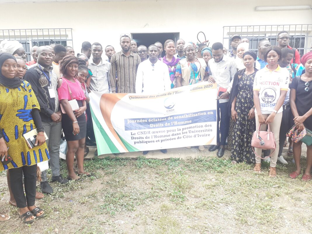 unite.ci, Bouaké le 8 décembre 2020 : Depuis sa création en 2004, le conseil national des droits de l’homme ( CNDH) à pour rôle de veiller à la bonne application de la loi en Côte d’Ivoire. Ce Mardi 08 Décembre 2020, à été une journée de sensibilisation et de formation pour les étudiants des universités publiques et privées de Bouaké par le Cndh de la région du Gkêkè dans une des salles du centre de recherche de l’université Alassane Ouattara de Bouaké.