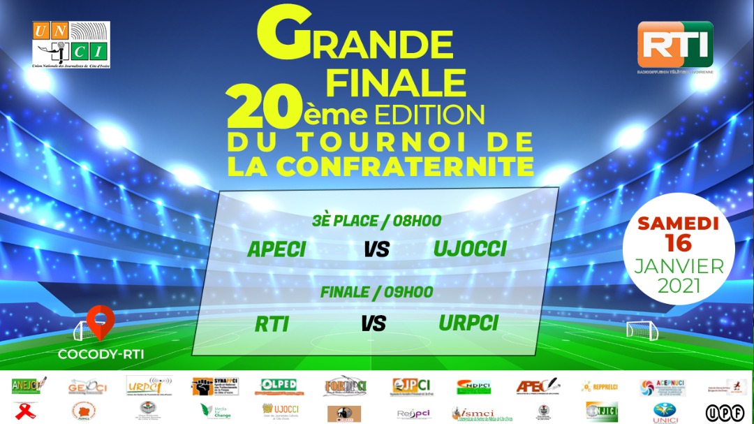 unite.ci, Abidjan le 14 janvier 2021 : Démarré le samedi 12 décembre 2020, la 20 ème édition du tournoi de la confraternité de l’Union nationale des Journalistes de Côte d’Ivoire (UNJCI) connaîtra son épilogue ce samedi 16 janvier 2021 au stade de la haute fréquence de la RTI. Cette finale mettra au prise l’équipe de la Radiotélévision ivoirienne (RTI) à celle de l’Union des Radio de Proximité de Côte d’Ivoire (URPCI).